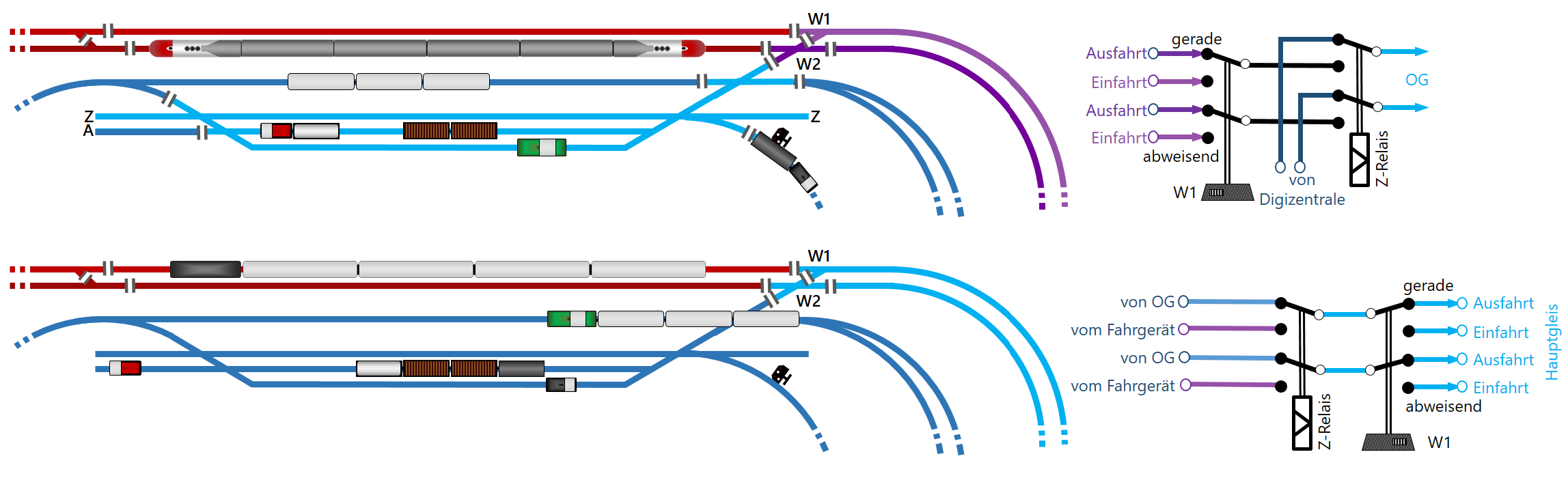 Dabei übernimmt die Oberleitung die Zufuhr der positiven Spannung, abgeleitet wird sie ebenfalls über die linke Schiene, die damit als gemeinsamer Rückleiter fungiert. Um die Oberleitungslok unabhängig von der über die rechte Schiene zugeführten Fahrspannung zu machen, darf der Motor natürlich keine Verbindung zu den in Fahrtrichtung rechten Rädern haben. Dazu dient ein in Elloks standardmäßig vorhandener Umschalter, mit dem sich Oberleitungs- oder Schienenbetrieb einstellen lässt. Werden Ellok-Modelle aus der Schiene versorgt, ist die Oberleitung nur Attrappe.